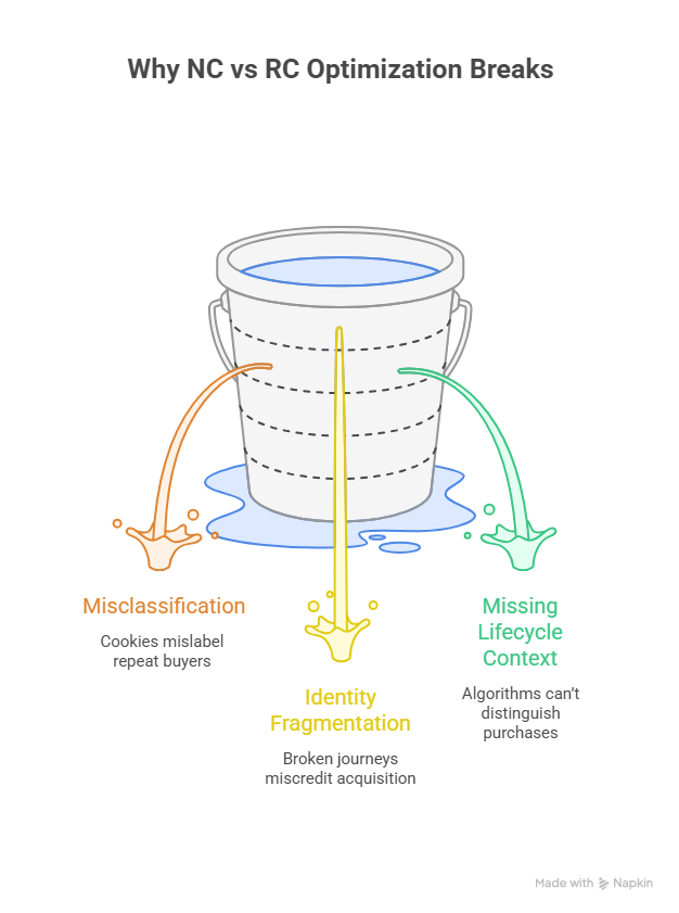 1. Misclassification - Cookie-based tracking counts device switches and guest checkouts as "new" customers, inflating acquisition metrics while hiding repeat-heavy delivery.